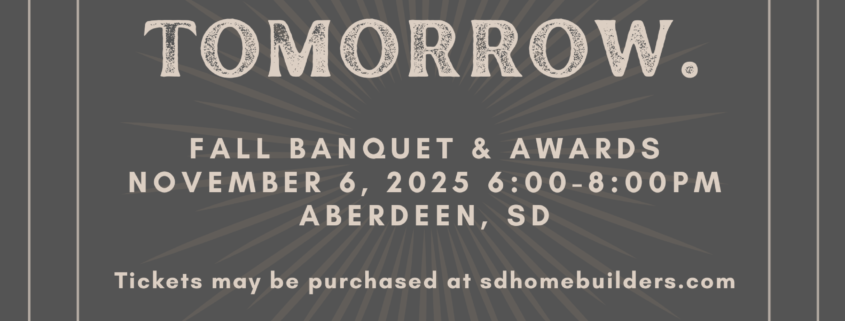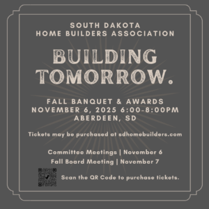 Room Block: Hampton Inn & Suites, 3216 7th Ave SE, Aberdeen. (Call 605-262-2600 to book rooms under the SD Home Builders room block)