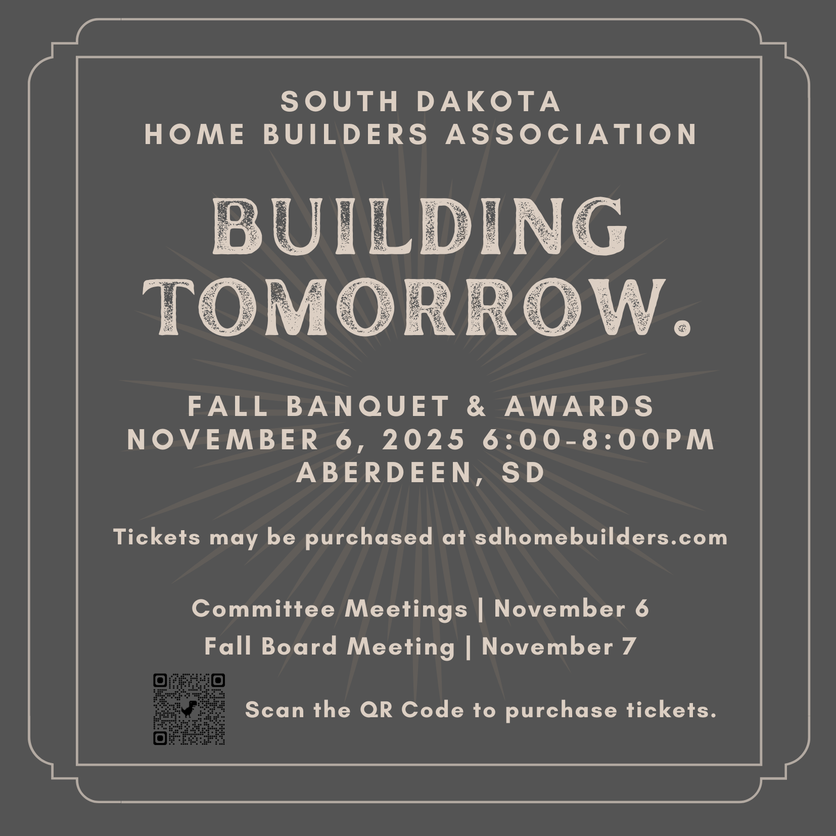 Aberdeen, SD Room Block: Hampton Inn & Suites, 3216 7th Ave SE, Aberdeen. (Call 605-262-2600 to book rooms under the SD Home Builders room block) Meetings: Dakota Event Center, 720 Lamont St S, Aberdeen Thursday, November 6: 8:30am - Senior Officer Meeting Thursday, November 6: 11:00am - Legislative Committee Meeting Thursday, November 6: 12:00pm - […]